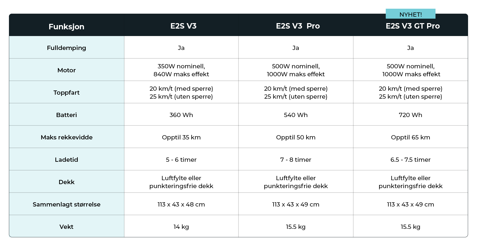 Det finnes flere modeller i E2S V3-serien, og hvilken som passer best for deg avhenger av hvordan – og hvor ofte du bruker el-sparkesykkelen. Nedenfor får du en enkel oversikt som hjelper deg å velge riktig modell for ditt bruk.